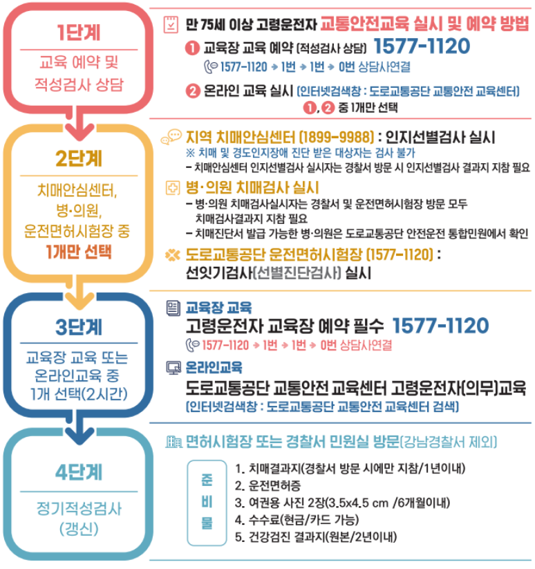 고령자 운전면허증 적성검사 갱신방법은 총 4단계로 이루어집니다. 각 단계별로 꼼꼼히 확인하시기 바랍니다.