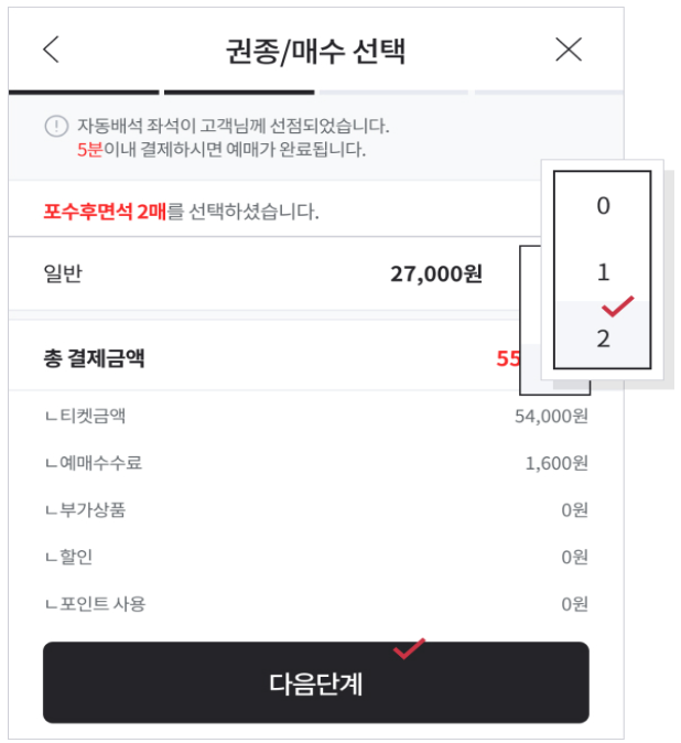 구매하고자 하는 권종의 매수를 선택합니다. 좌석 선점시간은 5분으로 자리는 이미 선점되었으니, 예매정보를 반드시 꼼꼼히 확인하고 결제하여야 합니다.