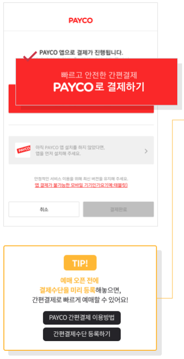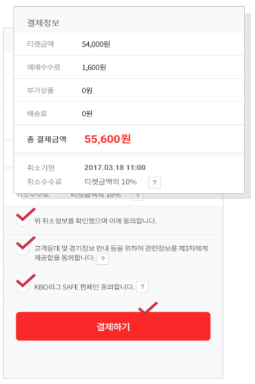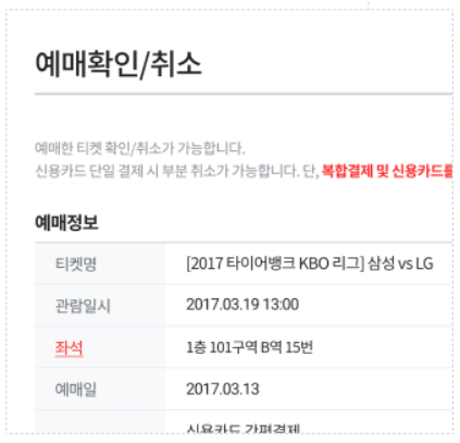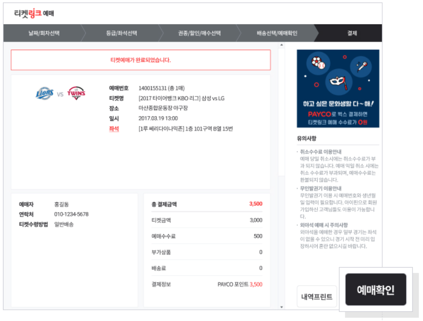 PAYCO를 이용해 간편 결제로 결제하면, 예매가 완료됩니다. 티켓팅이 완료되었다면 예매 확인은 필수적으로 하는 것이 좋습니다. 관람하고자 하는 경기의 원하는 좌석이 잘 예매되었는지 다시 한번 확인합니다.