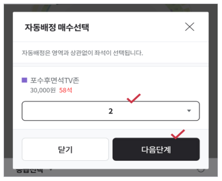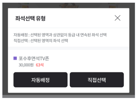 예매 팝업창이 열기면 좌석배치도에서 원하는 좌석 등급을 먼저 선택하고, 좌석선택 유형에서 자동배정 또는 직접선택 둘 중에서 원하시는 방식대로 선택을 합니다.
