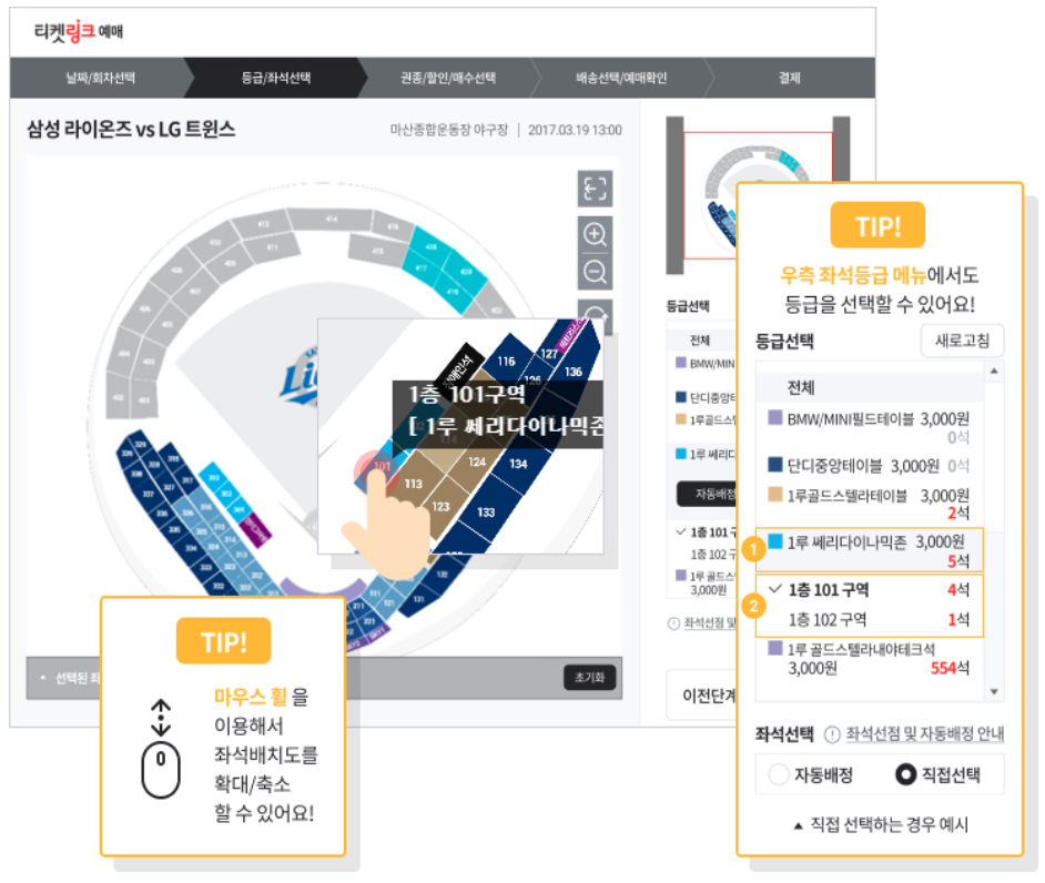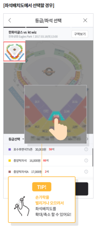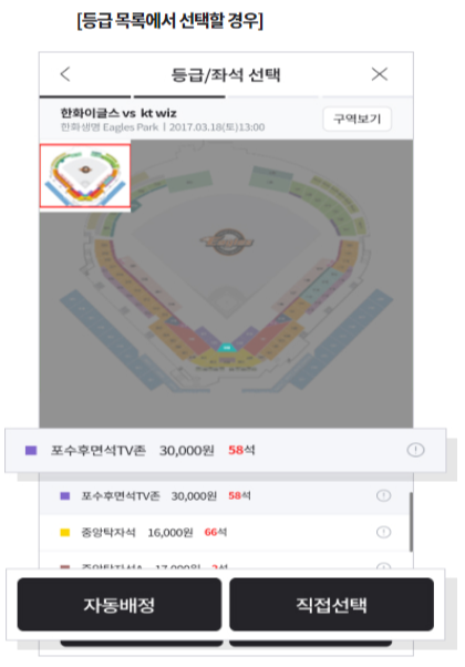 티켓링크 어플 각 구단 페이지에서 관람하고자 하는 스포츠 경기의 예매 오픈 시간에 맞춰 예매하기를 합니다. 좌석배치도에서 또는 하단의 등급 목록에서 원하는 등급의 좌석을 선택합니다.