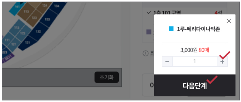 등급별 잔여석을 확인하고 원하는 구역과 좌석을 선택한 다음 다음단계로 넘어갑니다.