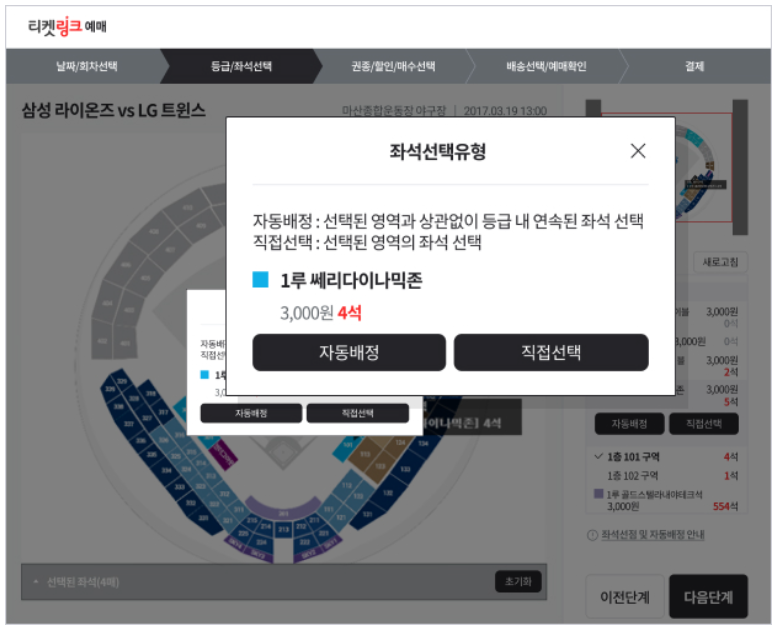 자동배정 또는 직접선택 좌석선택 유형을 원하는 방법으로 선택을합니다.