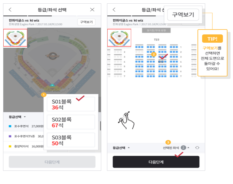 등급별 잔여석을 확인하고 원하는 구역과 좌석을 선택하고 다음단계를 선택합니다.
