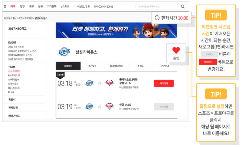 왼쪽의 각 구단 페이지에서 관람하고자 하는 스포츠 경기의 예매 오픈 시간에 맞춰 예매하기를 합니다.